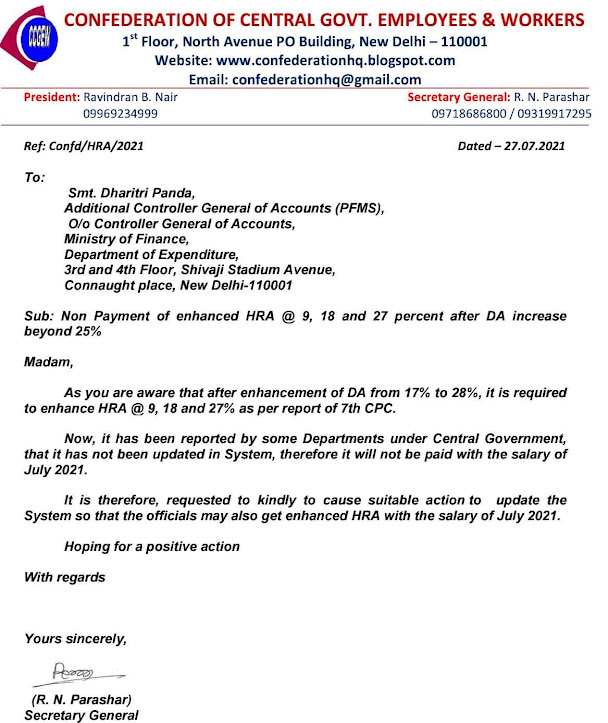 As you are aware that after enhancement of DA from 17% to 28%, it is required to enhance HRA @ 9, 18 and 27% as per report of 7th CPC.